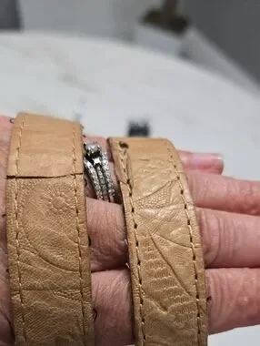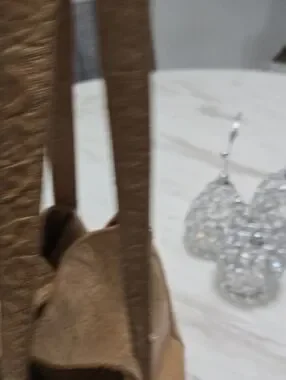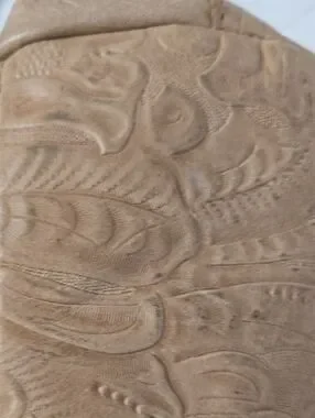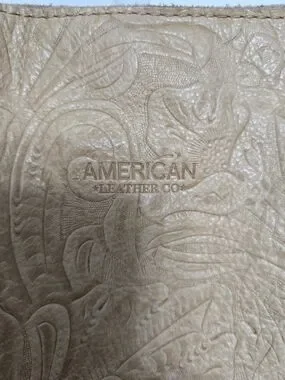 American Leather shoulder bag in tan with an embossed floral pattern. Soft leather construction for a polished look. Neutral tan color pairs easily with many outfits.