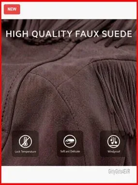 Details: Lapel collar, decorative front pocket, two zippered side pockets, fringe trim on back and sleeves