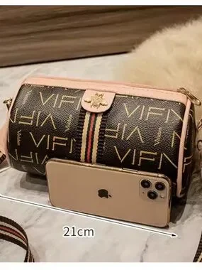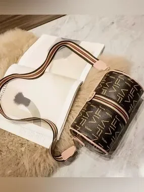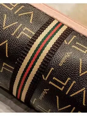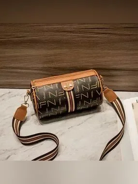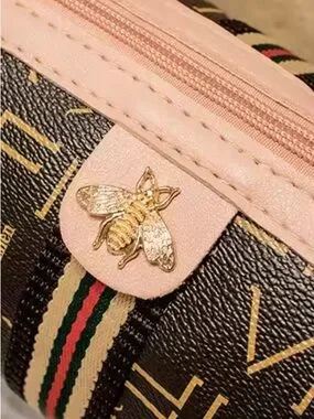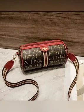 Chic barrel-shaped crossbody bag featuring an all-over letter monogram print in brown and gold. Accented with a signature red and green stripe ribbon detail and a gold bee emblem closure — very designer-inspired aesthetic. Apricot/Brown/Black/Red PU faux leather trim with gold-tone zipper and adjustable crossbody strap included.