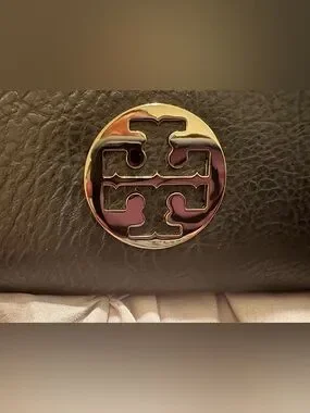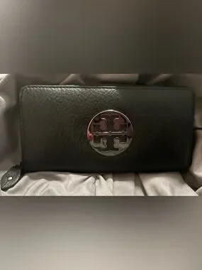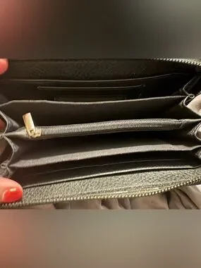 Compact black leather wallet. Multiple card slots and compartments. Subtle gold-tone hardware detail. Clean, structured design.