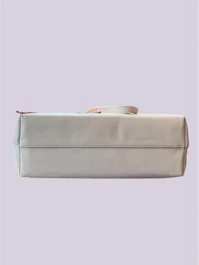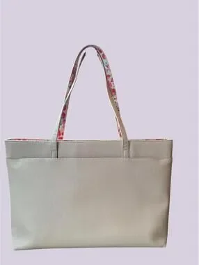 This stylish Pink tote bag features a smooth, durable exterior with a spacious interior perfect for everyday use or work. The bag is accented with a removable floral scarf tied into a bow, adding a touch of feminine charm. The handles are lined with the same floral pattern, providing a cohesive and elegant look. Its structured base ensures the bag maintains its shape while offering ample room for essentials.