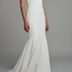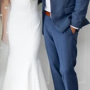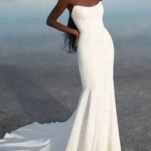 Sleek gown. Fitted mermaid silhouette with gentle train. Minimalist and modern bridal look. Clean lines and smooth fabric. Elegant for a contemporary ceremony.