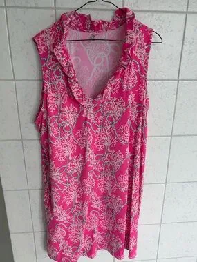 Bright hot pink sleeveless dress with delicate cream and gray scroll print. Soft V-neck with subtle ruffle trim for a feminine touch. Lightweight, breathable fabric for all-day comfort.