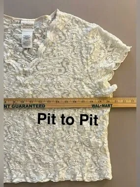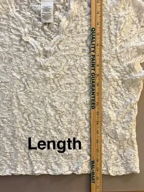 Elegant cream lace blouse with scalloped V-neck and flutter sleeves. Lightweight, breathable fabric for all-day comfort. Versatile cream top that dresses up easily for events or casual outings. Flattering fit with delicate lace detailing.
