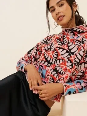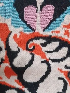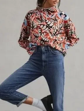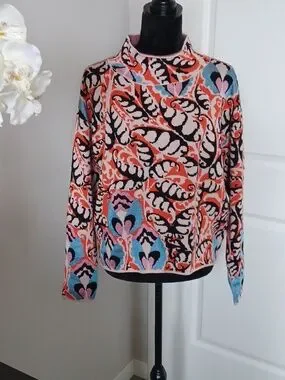This is a gorgeous Maeve by Anthropologie “Carys” mock-neck sweater with all the spring vibes. It features a fun allover multicolored abstract pattern involving orange, cream, blue, pink & black.
