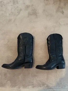Black leather cowboy boots with embroidered detailing. Side zipper for easy on and off. Stacked heel and pointed toe. Timeless western style. Versatile and sleek.