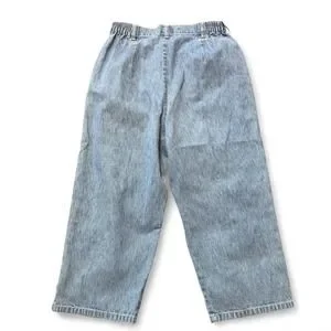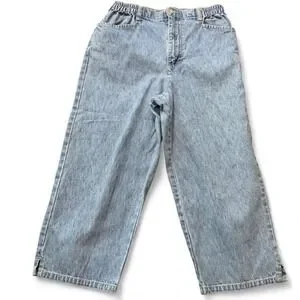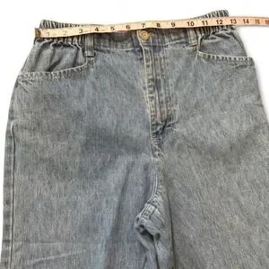 Vintage 90s Gloria Vanderbilt Cropped Jeans, Women's Size 4P. High waisted featuring retro elastic "paperbag" style waistband. Relaxed wide leg in light wash for classic 90s mom jean aesthetic. #vintage90s #momjeans #croppedjeans #bohochic #vintagegloriavanderbilt