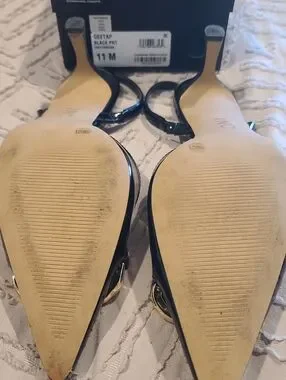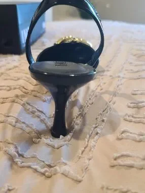 Sleek patent slingback pumps by INC International Concepts. Pointed toe silhouette with decorative gold chain across vamp. Slim slingback strap for a secure fit. Shiny finish ideal for evening wear. Worn 1 time