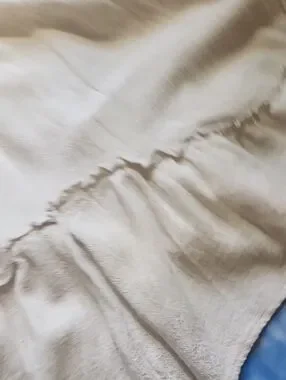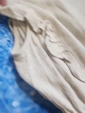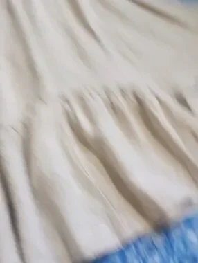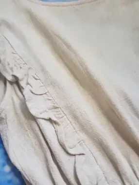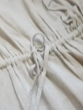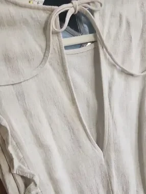 Sleeveless cream mini dress with ruffle trim. Drawstring waist for adjustable fit. Flared skirt with tiered ruffle detail. Lightweight textured fabric (part flax) for easy wear.