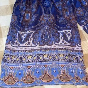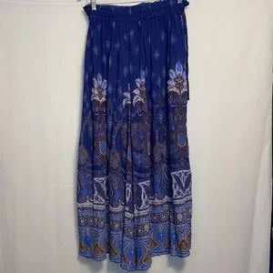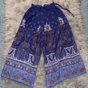Flowy wide-leg pants with a paisley and boho border print. Elastic waistband with drawstring. Lightweight, breezy fabric. Bold blue and brown tones with lilac accents.