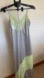 Satin silver slip dress with lime green lace accents. Spaghetti straps and V-neckline. Feminine lace panels for a stylish look.