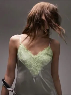 Topshop Silver Slip Dress with Lime Lace Trim