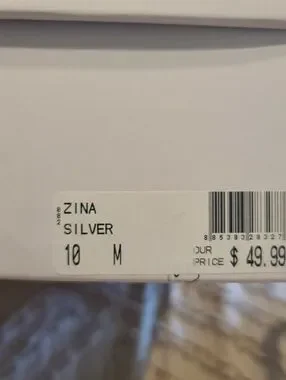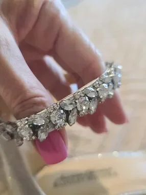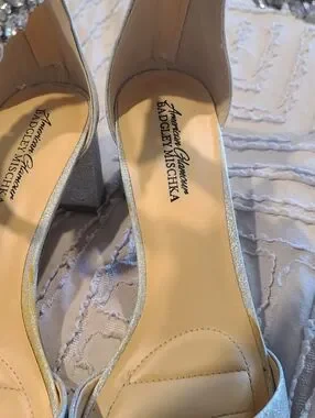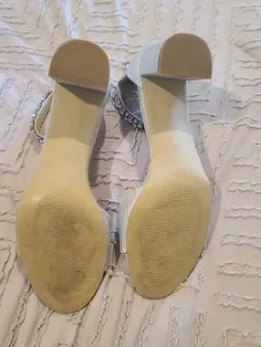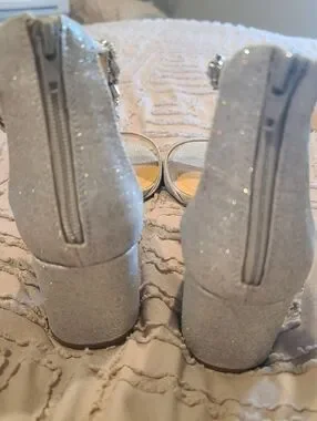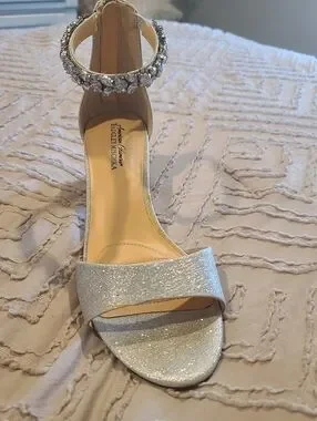Silver block heel with glitter finish. Jeweled ankle strap for added sparkle. Open toe silhouette with cushioned footbed. Stylish choice for formal occasions. Gently used, worn 1 time
