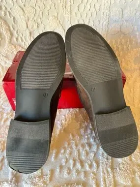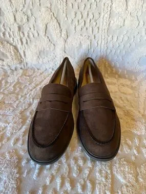 Women's slip-on loafers with a classic penny strap. Suede upper in deep brown. Low-profile sole for comfortable wear. Versatile casual-to-dress style.
