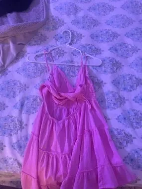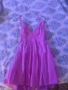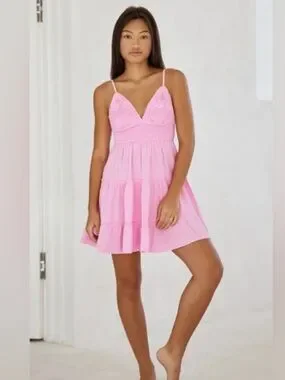 Lightweight pink sundress with adjustable straps. Open back with a bow tie detail. Flowy tiered skirt for a playful silhouette. Perfect for warm-weather outings.