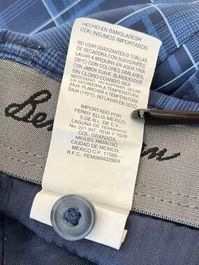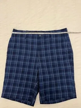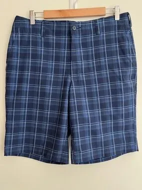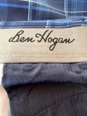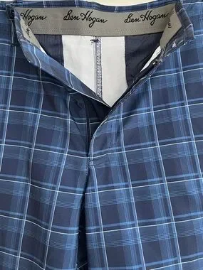 Ben Hogan blue plaid lightweight flat front golf shorts. Inner elastic band around waist. Belt loops. Slash side pockets and rear pockets, one with a button, one open. Button and fly closure. Extra button on interior tag. 94% polyester/6% elastane.