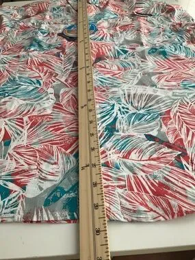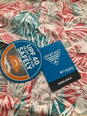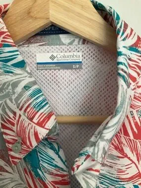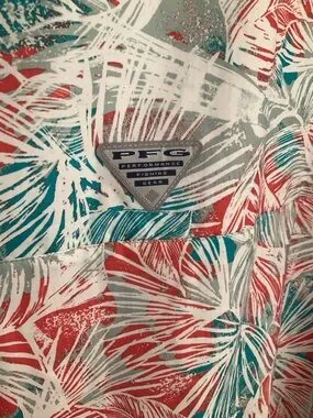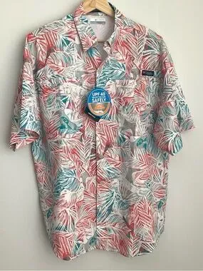 Columbia PFG Omni-wick UPF 40 Omni-Shade short-sleeve button-down with coral and teal tropical leaf print. Lightweight, breathable fabric. UPF sun protection. Classic camp-style collar. Easy casual wear for warm weather. New with tags!