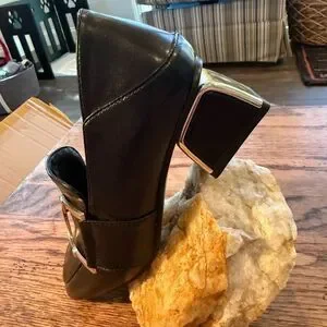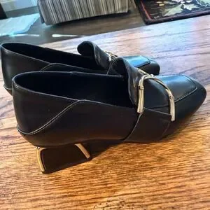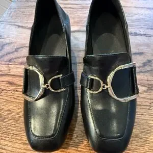 Chic black leather loafer heels with bold gold bit/buckle hardware and a modern sculptural block heel with metallic detail. Square toe gives a sleek, dressy look—great for workwear or going-out outfits.