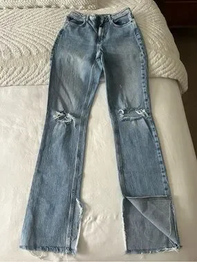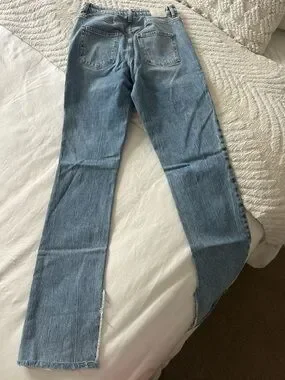 High-rise women’s jeans from Zara. Light blue washed denim with classic stitching. Clean leather logo patch on back waistband. Timeless casual style.