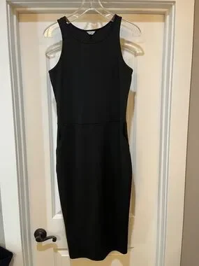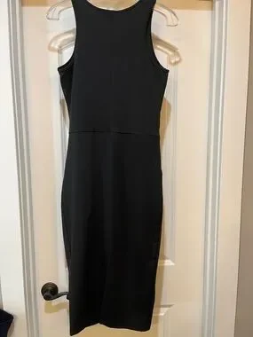 A sleek black sleeveless midi dress with a tailored sheath silhouette. Smooth, versatile fabric provides a polished look for work or events. Subtle seam at the waist creates a flattering shape. Easy to pair with heels or a blazer for day-to-evening styling.