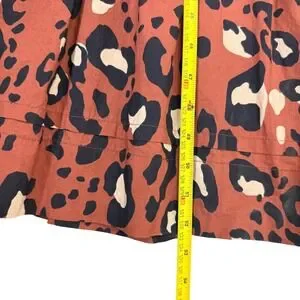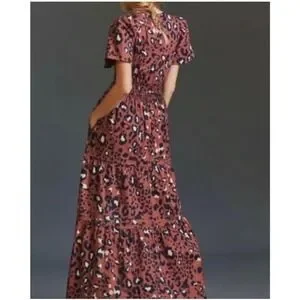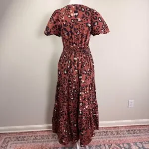 Maeve Anthropologie Somerset maxi dress in a bold brown leopard print. This iconic silhouette features a smocked waist for a comfortable, defined fit and a tiered skirt that adds graceful movement. Designed with a split V-neckline, short flutter sleeves, and practical side pockets, it offers a perfect blend of style and utility. The cotton-blend fabric provides a crisp yet breathable feel, making it ideal for year-round wear.