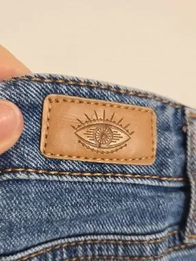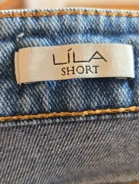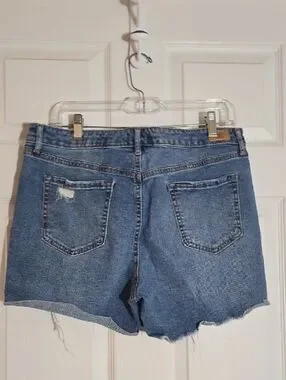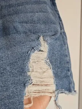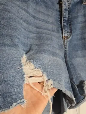 High-rise denim shorts with intentional distressing and raw frayed hem. Relaxed fit through the hips and thighs. Functional front and back pockets. Easy, casual style for warm days.