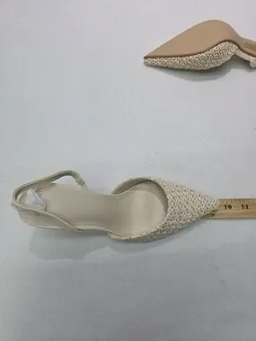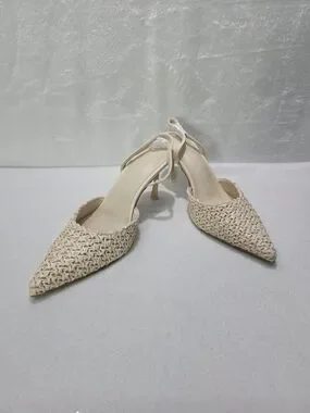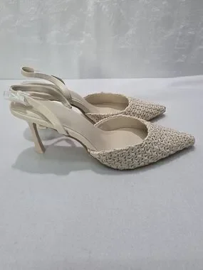 Elegant cream woven pointed-toe slingback heels. Lightweight woven upper with a sleek pointed silhouette. Comfortable slingback strap for a secure fit. Stylish cream color that pairs well with both casual and dressy looks.