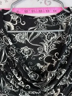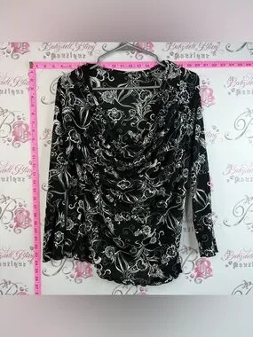 Elegant black long-sleeve top with a white floral print and a soft draped cowl neckline. Lightweight, stretchy fabric offers comfortable all-day wear. Stylish pattern suits both casual and dressier looks. Available in black and white colors. πβοΈπβ¨π©·ππ©΅