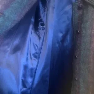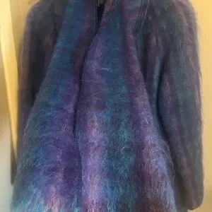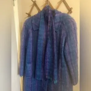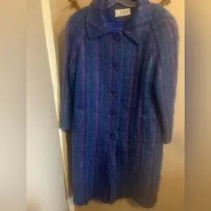 Stun in this gorgeous vintage Fashion Gallery longline coat. Crafted from a luxurious and fuzzy mohair-wool blend, this piece features a vibrant cobalt blue and royal purple vertical stripe/plaid pattern. It’s the perfect blend of Cottagecore charm and Grandmillennial sophistication.