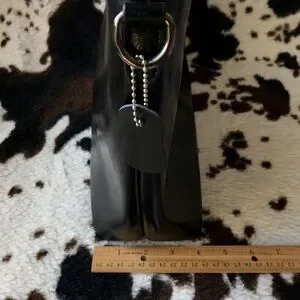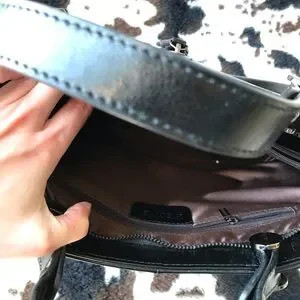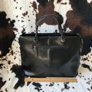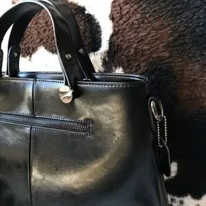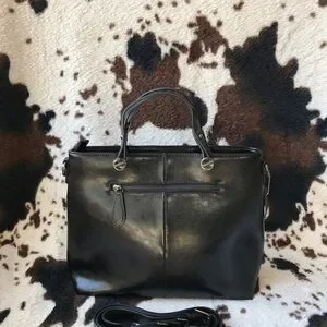 Buttery black leather-look tote with top handles and removable strap. This thing is sleek and slim, yet loaded with pockets (one on each exterior side, a large zippered section and additional zipping pocket inside, and two further “compartment” open-top interior pockets). Removable strap also adjusts for maximum styling options!