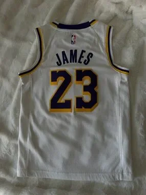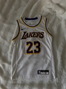 Authentic Nike basketball jersey. White mesh fabric with purple and gold accents. Team name and numbering visible on front. Dri-FIT branding at collar. Sporty crew neckline.