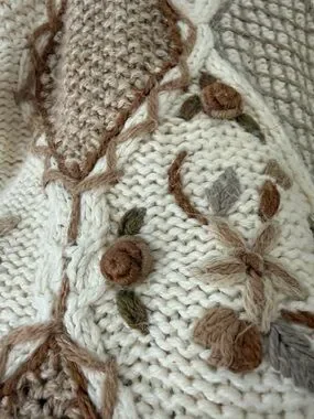 Very cool vintage granny core chunky knit oversized pullover sweater from the 1990's featuring a multi-color cabled design with flowers and leaves. This sweater is made with Ramie wool and so so soft!