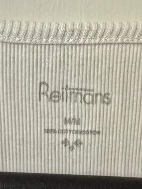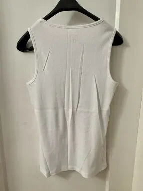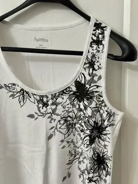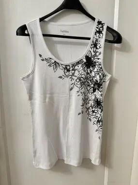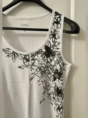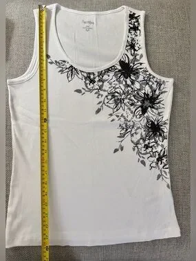 Lovely white ribbed 100% cotton tank top with a spread of light grey and black etched floral pattern along left neckline and cascading down left side. Back is plain. Fitted style. Measures 17 inches armpit to armpit; 23.75 inches in length.