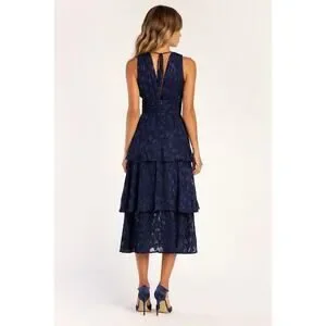 Lulu’s Make It Mesmerizing Navy Blue Jacquard Tiered Midi Dress, XS