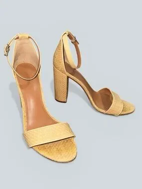 Raffia heeled shoes with woven texture, open toe, wide front strap, adjustable ankle strap, and block heel.