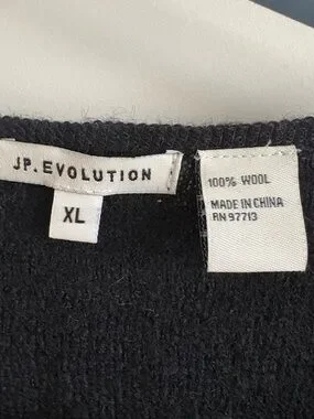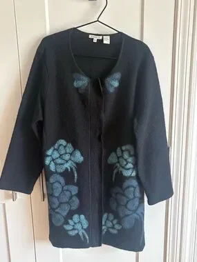 Black Open-Front Wool Cardigan with Teal Floral Accents