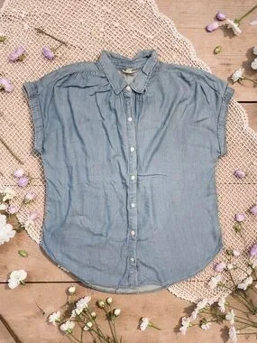 Casual light blue denim short-sleeve button-front shirt. Features a classic collar and pearl-style buttons. Relaxed fit with soft, breathable fabric. Easy to layer for everyday wear.