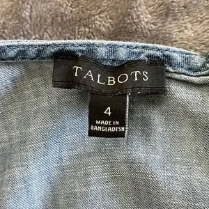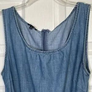 Talbots sleeveless denim dress features a classic scoop neckline and a flattering fit-and-flare silhouette. Crafted from 100% cotton chambray, this midi-length piece includes a matching self-tie belt with decorative tassel ends and a ruffled hem for added texture. A back zipper closure ensures a secure fit, making it a versatile choice for casual outings or daytime events.