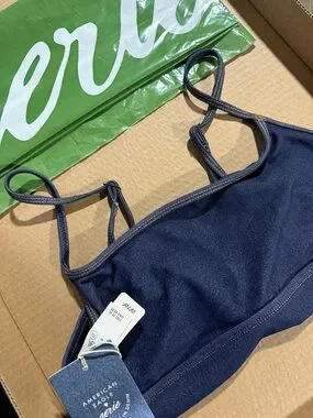 aerie bralette in dark navy with thin adjustable straps. Light support and smooth stretch fabric. Seamless look ideal for layering. Simple, everyday style.