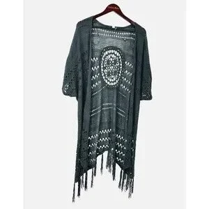Womens Sleeveless Long Crochet Shawl Open Cardigan Cover Up Fringe Gray Sz S 1344H