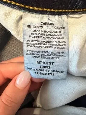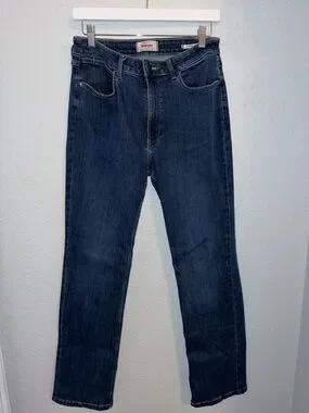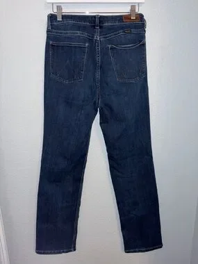 True high rise straight-leg Wrangler jeans in a deep blue wash. Size 10X32. Worn only a few times. 78% Cotton, 20% Polyester, 2% Spandex. There is some stretch in them!