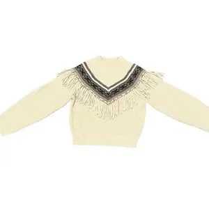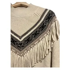 Cozy cream crew sweater with fringe trim. Fair Isle yoke detail in contrasting dark tones. Ribbed high neckline and cuffs. Soft knit for everyday wear.