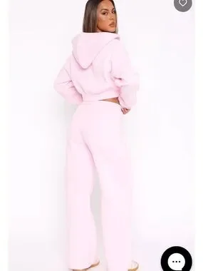 Relaxed wide-leg sweatpants in a soft light pink hue. Elastic drawstring waist for easy fit. Smooth, cozy fabric for everyday wear. Easy to style with matching tops or sneakers.