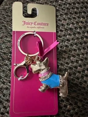Juicy Couture Gold Scottie Keychain with Blue and Pink Accents