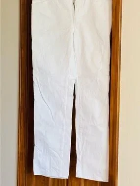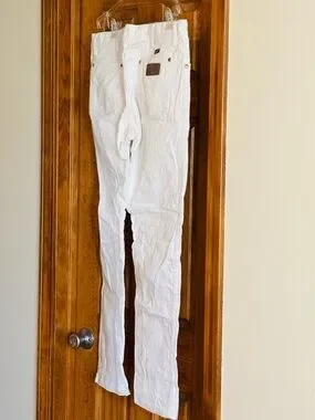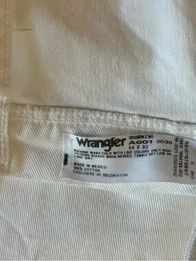 White denim jeans by Wrangler. Classic five-pocket styling. Visible branded label on waistband. Clean, neutral color for versatile pairing. Barely worn like new. 34x32