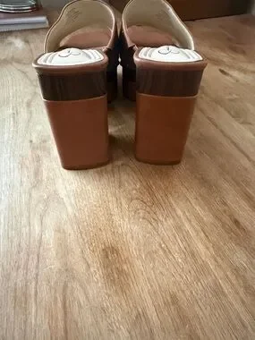 Chunky platform mules with a wide leather upper. Studded trim along the wood-look platform. Block heel for stable lift. Padded insole for added comfort. Stylish warm brown tone for casual outfits.