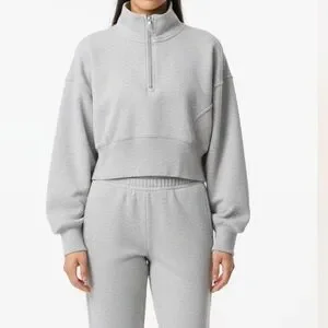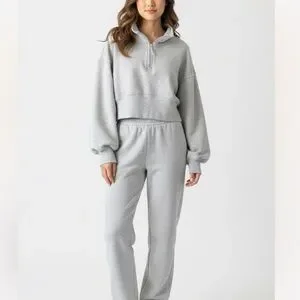 Soft quarter-zip pullover with cropped hem. Relaxed drop shoulder and balloon sleeves. Cozy knit fabric for everyday wear. Pairs well with matching joggers.