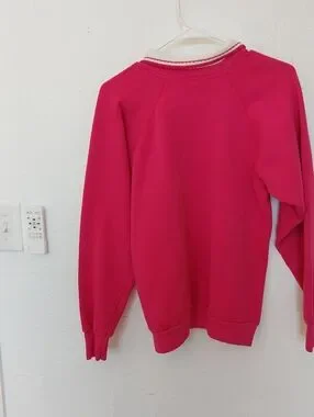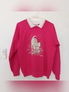 Vibrant pink sweatshirt with playful cat graphic on front. Contrasting white polo-style collar. Soft, casual fit great for everyday wear.