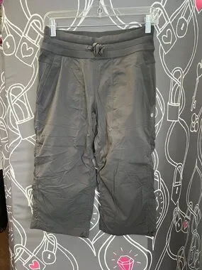 Lightweight cropped capris with a drawstring waist. Slim pockets for small essentials. Relaxed fit through the leg for easy movement. Neutral gray pairs well with many tops.