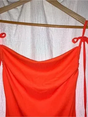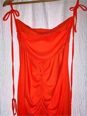 Sleek dress with adjustable tie shoulders. Bias cut drape at the neckline. Lightweight fabric. Bright orange color for a bold look.